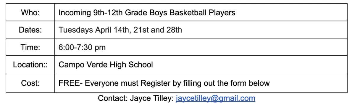 Campo Verde High School Boys Basketball program will be holding a Free Camp on April 14th, 21th and 28th. Players will play 5v5 full court competitive games. This clinic is for incoming 9th-12th Graders that have experience playing competitive basketball.
